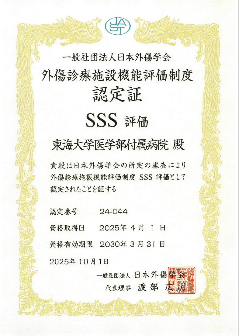日本外傷学会より外傷診療施設機能評価制度でSSS評価をいただきました。